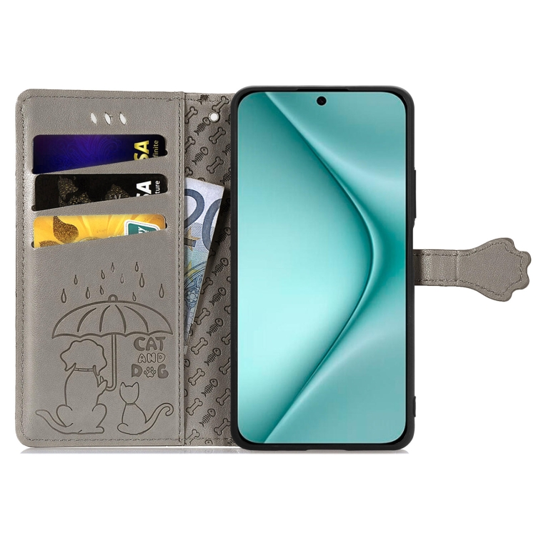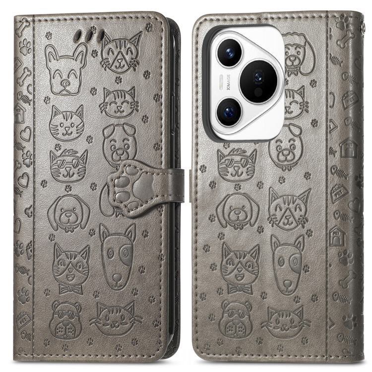 Funda para Huawei Pura 70 Pro de Cuero con Relieve de Perro y Gato (Gris)