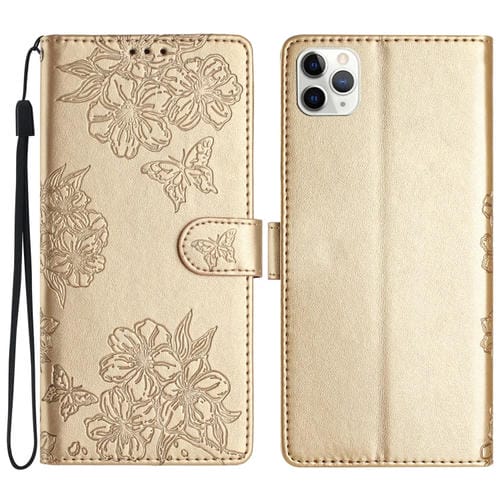 Funda para teléfono iPhone 11 Pro Max Cherry Blossom Butterfly Skin Feel de PU en relieve (Oro)