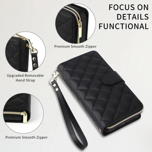 Estuche para Teléfono iPhone 12 Mini Cuero Hebilla Torre Cremallera Rómbica Cruzada con Cordón (Negro)