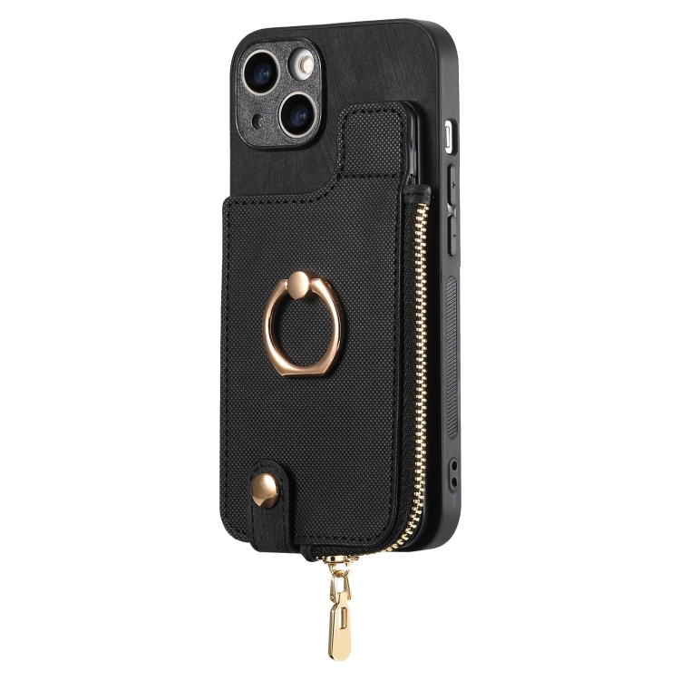 Estuche para teléfono iPhone 12 Pro con billetera, cremallera vertical y anillo de cuero cruzado (Negro)