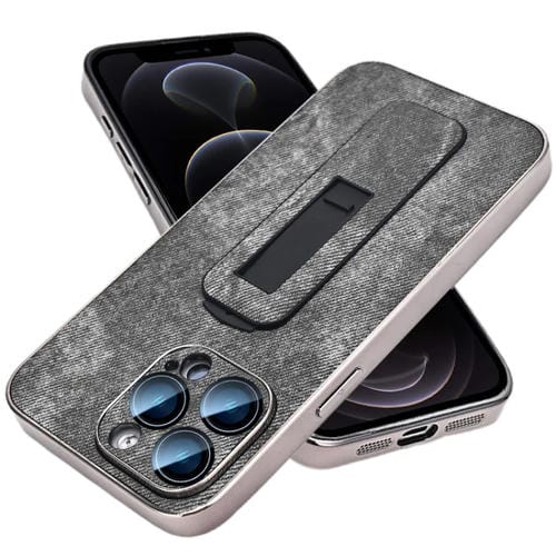 Estuche para teléfono iPhone 12 Pro con enfriamiento y soporte push-pull galvanizado con patrón de mezclilla (Negro)