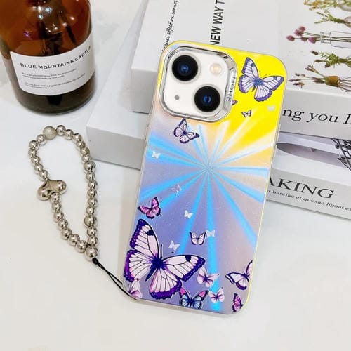 Funda para Teléfono iPhone 13 Mariposa Láser Galvanizada con Correa para Muñeca (Morado)