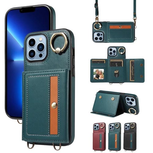 Bolso Cruzado para iPhone 13 Pro Max Funda de Cuero con Soporte para Anillo y Tarjeta (Verde)