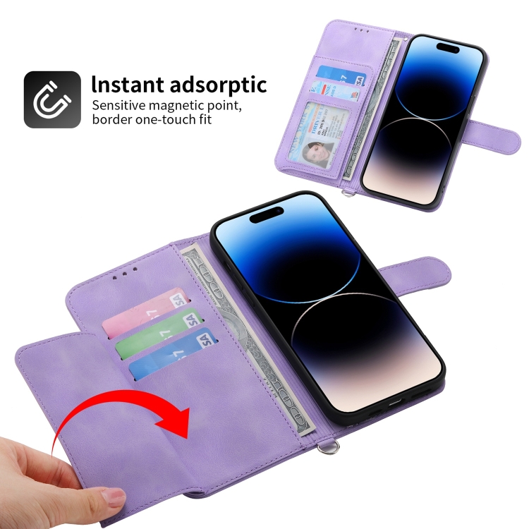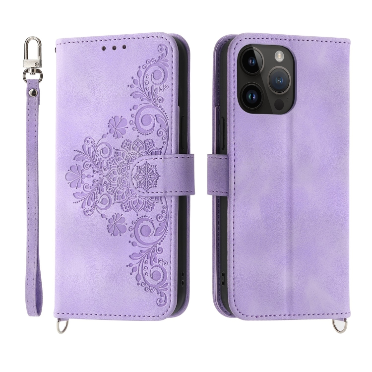 Funda de Cuero Skin-Feel Flowers para iPhone 13 Pro con Billetera en Relieve (Púrpura)