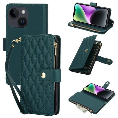 Funda de Cuero para iPhone 14 Plus Ym016 con Billetera, Tarjeta, Cremallera Rómbica y Cordón (Verde)