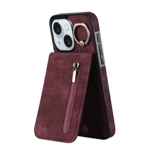 Pour iPhone 15 Retro Ring Zipper RFID Card Slot Phone Case (vin rouge)