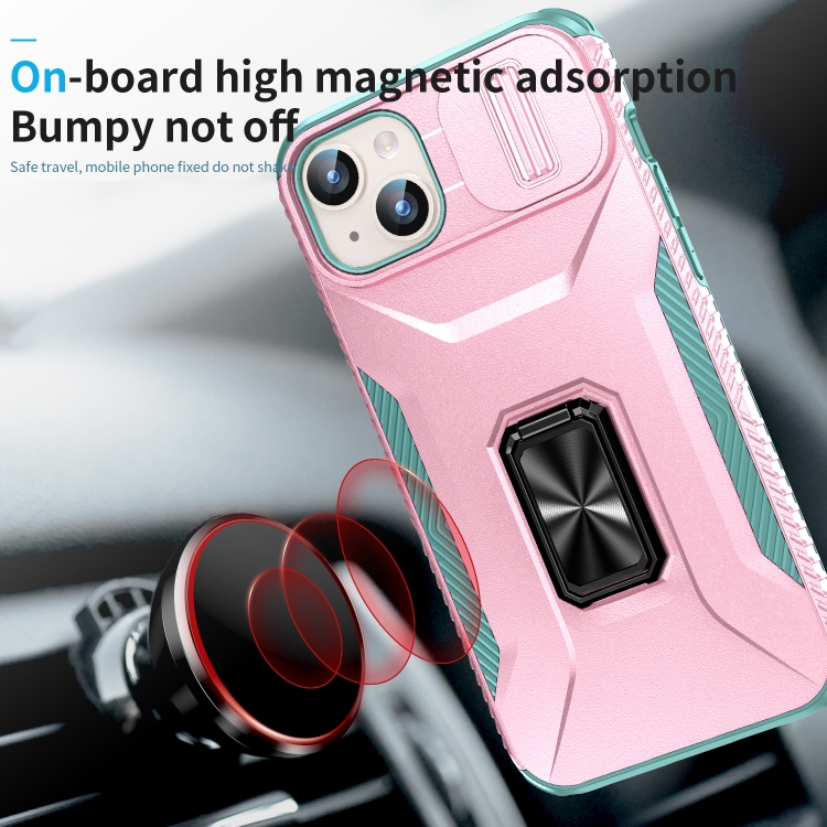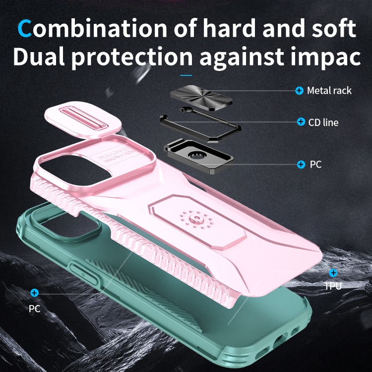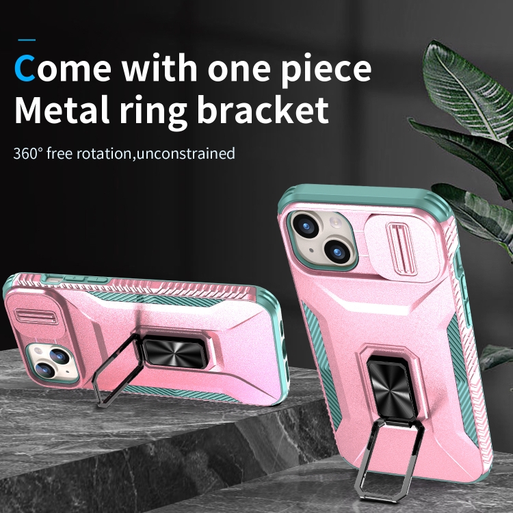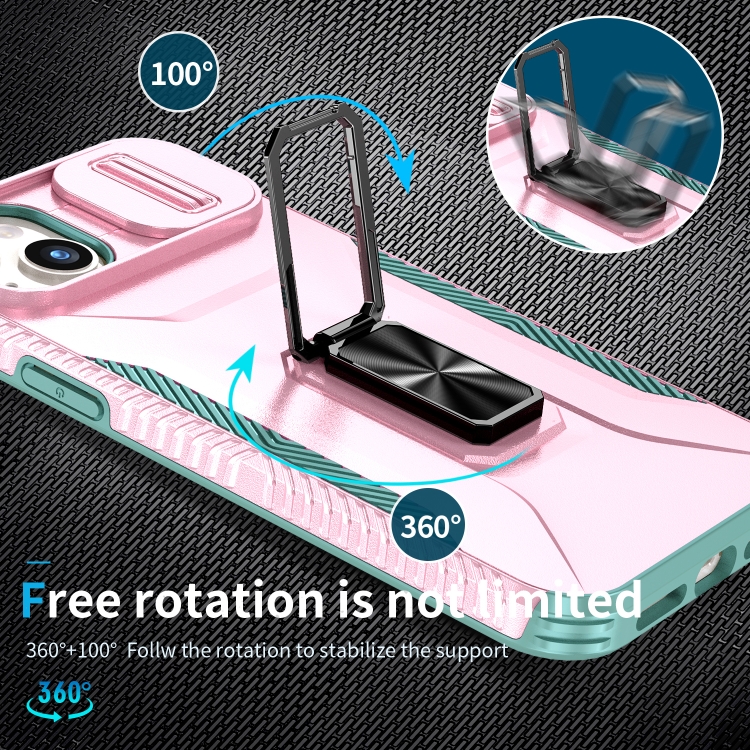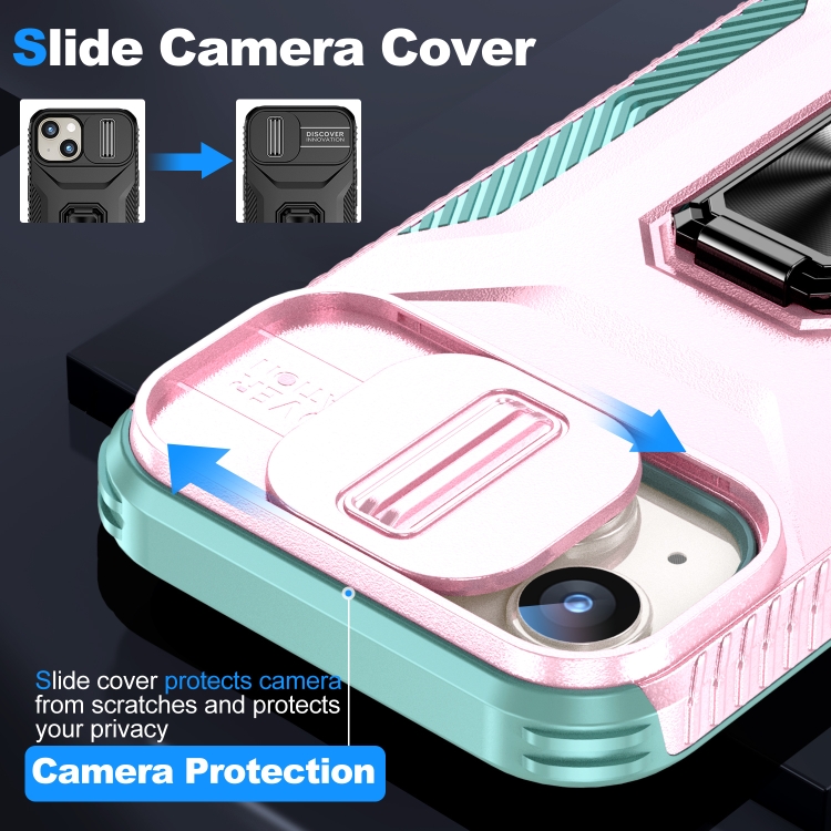 Estuche para teléfono iPhone 15 con soporte deslizante para levas (Rosa + Gris Verde)