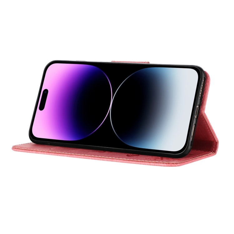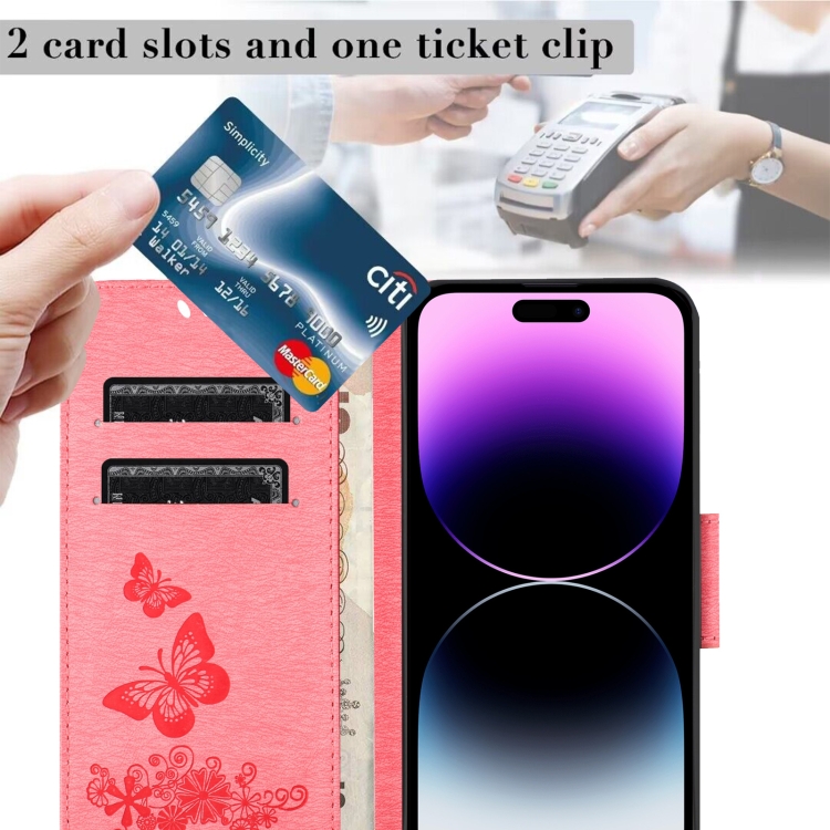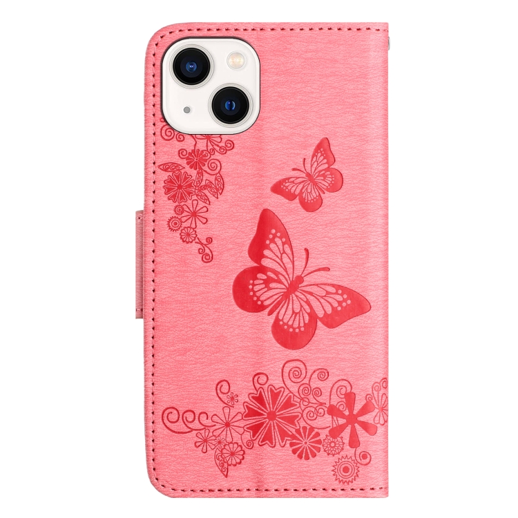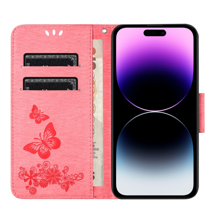 Funda de Teléfono para iPhone 15 de Cuero con Tapa en Relieve de Mariposa (Rosa)