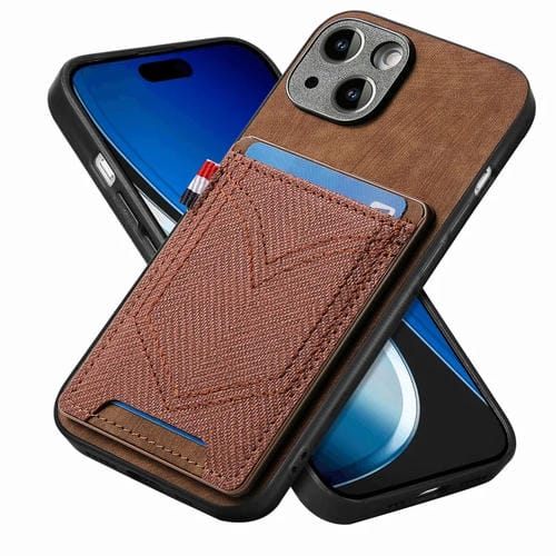 Funda de Teléfono iPhone 15 Piel de Cuero Textura Mezclilla Ranura para Tarjeta (Marrón)