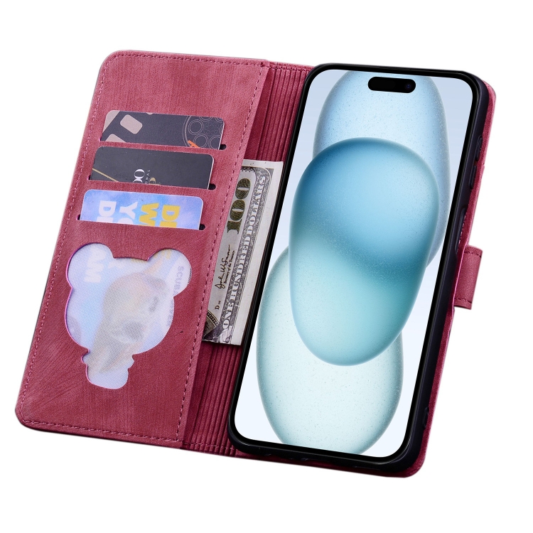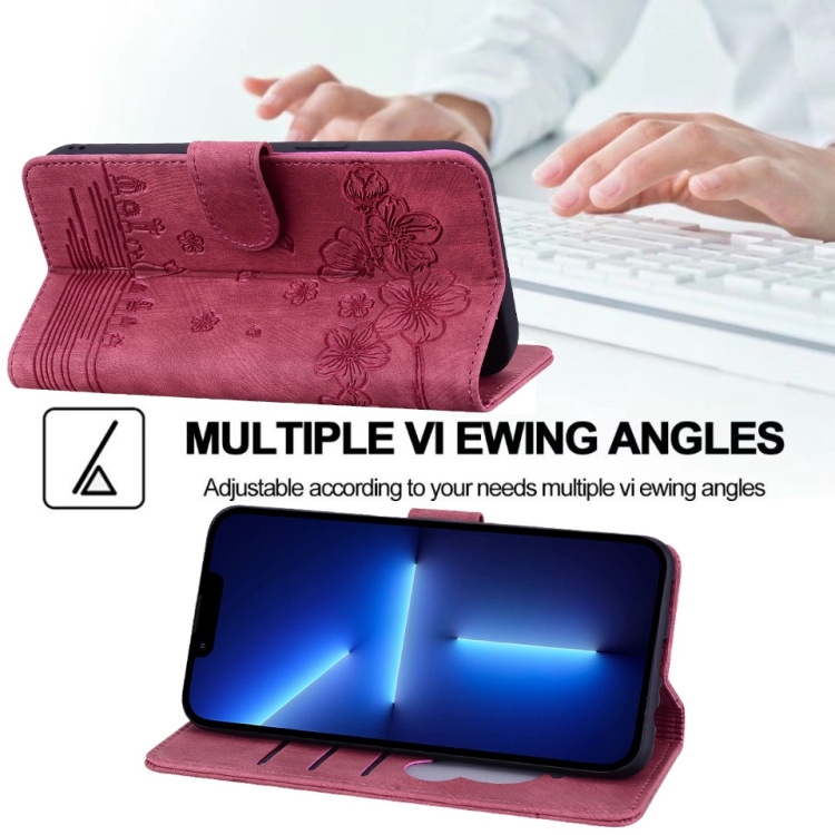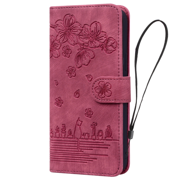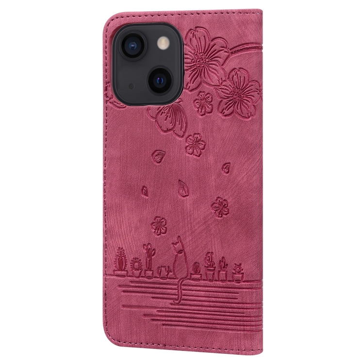 Funda para Teléfono iPhone 15 Cuero con Relieve de Gato Sakura Dibujos Animados (Rojo Vino)