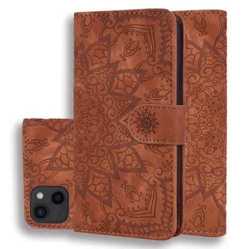 Funda para Teléfono iPhone 15 Piel de Becerro Doble Pliegue Relieve Mandala (Marrón)