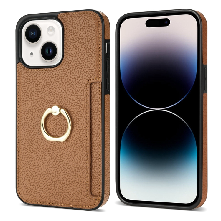 Funda Trasera de Cuero Ring Card para iPhone 15 Plus (Marrón)