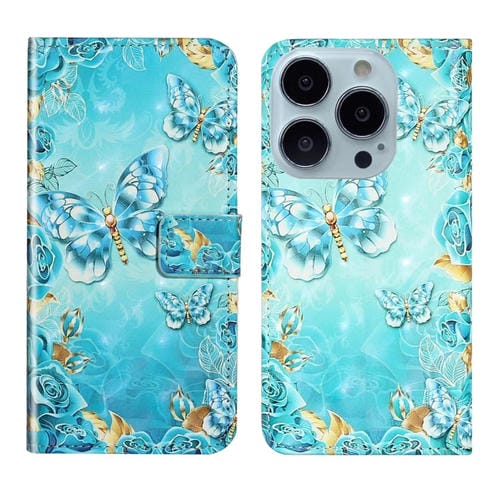 Funda de Teléfono iPhone 15 Pro Cuero Dibujo 3D Relieve al Óleo (Mariposas Azules)