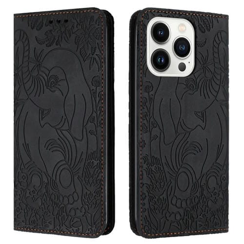Funda de Teléfono iPhone 15 Pro Cuero con Relieve de Elefante Retro (Negro)