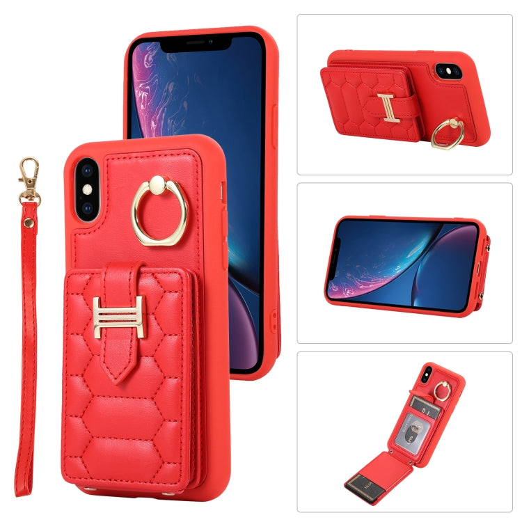Estuche para Teléfono iPhone Xs Bolsa de Tarjeta Vertical con Soporte de Anillo y Cordón Doble (Rojo)