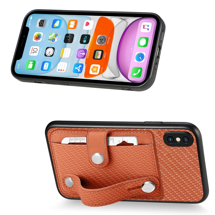 Funda para iPhone Xs Max Wristband Kickstand Card Wallet Back Cover con Tool Knife (Marrón)