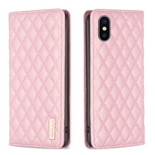 Funda de teléfono para iPhone Xs / X con tapa de cuero magnético Diamond Lattice (Rosa)