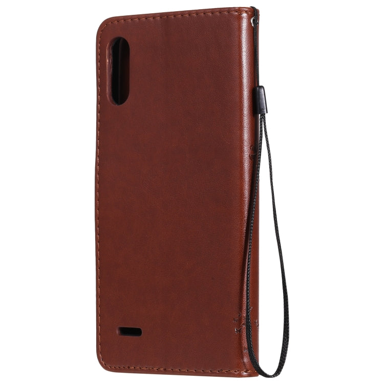 Funda Cuero PU LG K22 K22 Plus con Patrón Árbol y Gato, Tapa Horizontal, Soporte, Ranuras y Cordón (Café)