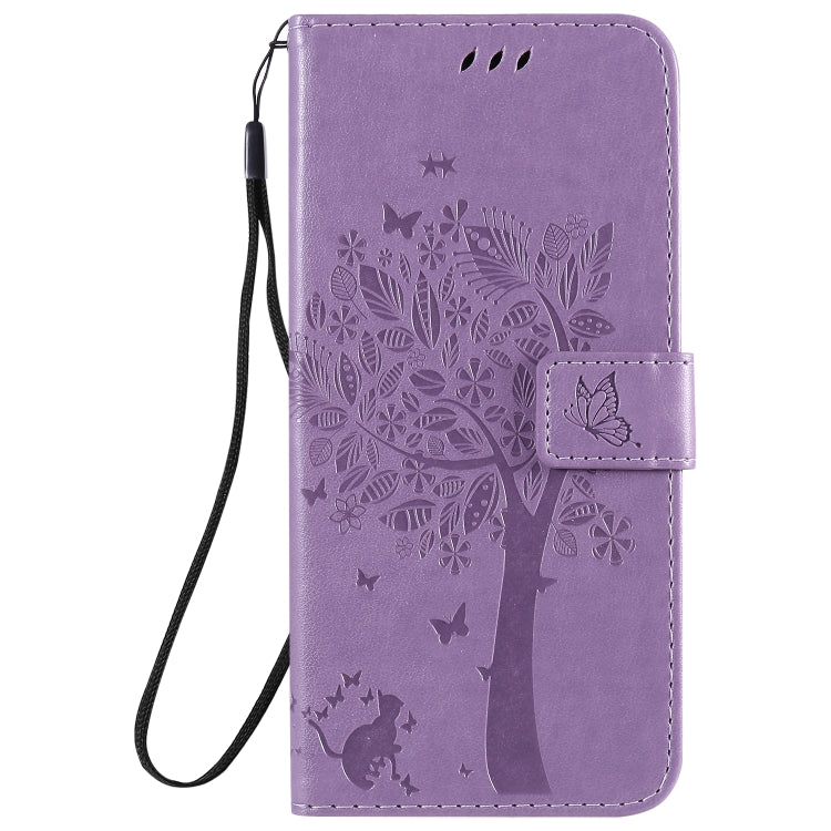 Funda de Cuero para LG K50S con Tapa Horizontal, Patrón Árbol y Gato, Soporte, Ranuras y Cordón (Morado Claro)