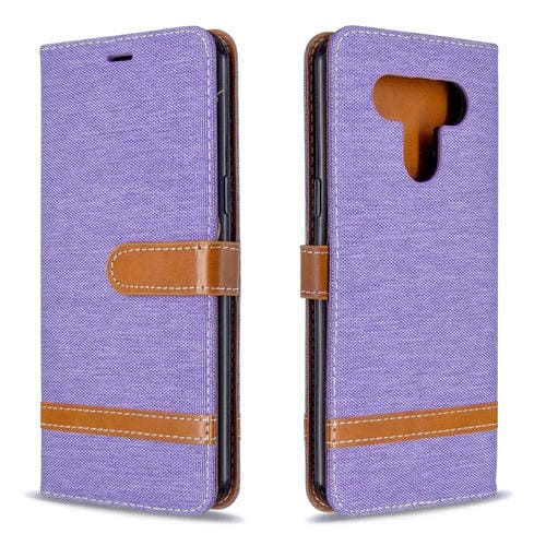 Funda de Cuero para LG K51 con Tapa Horizontal, Textura Mezclilla, Soporte, Ranuras para Tarjetas y Cordón (Morado)