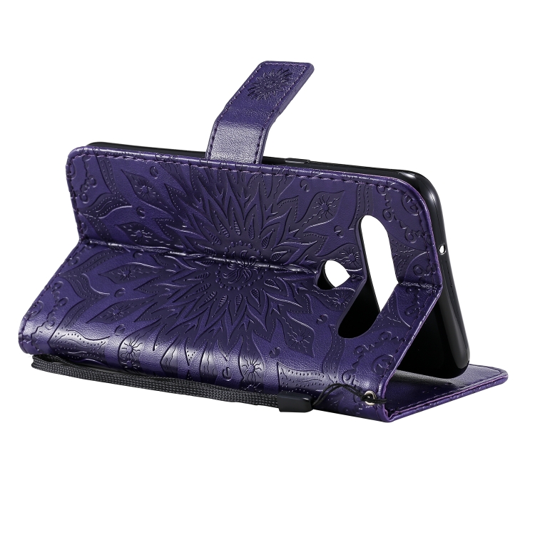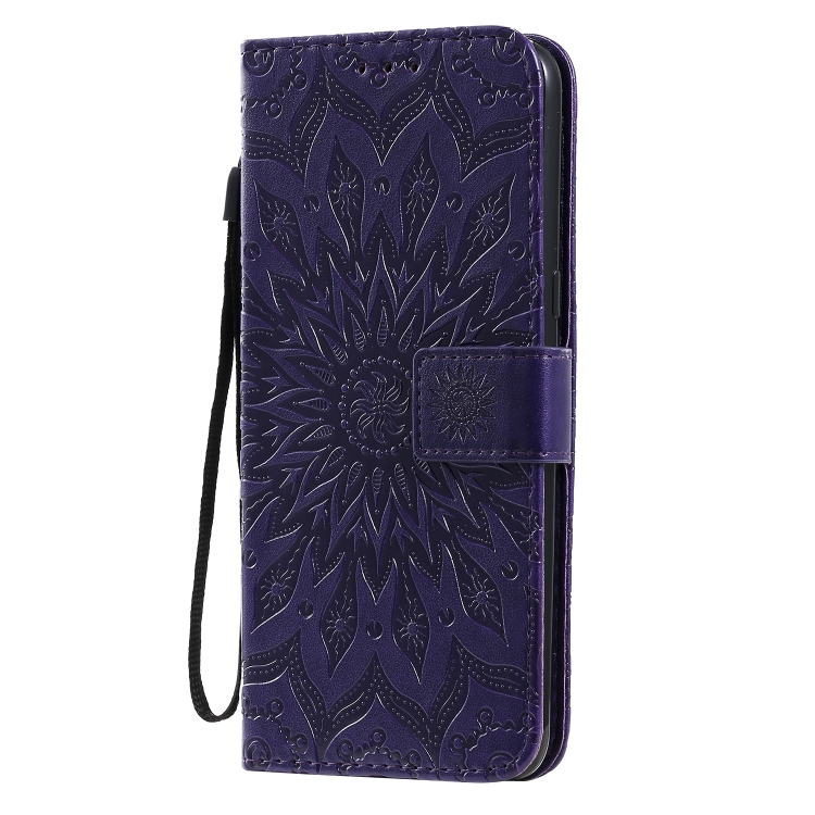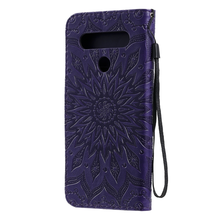 Funda Cuero PU LG K61 Flip Horizontal con Patrón Girasol, Soporte, Ranuras y Cordón (Morado)