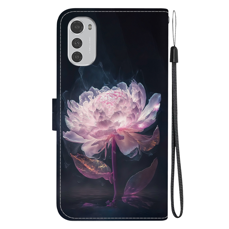 Funda de Cuero para Motorola Moto E32 con Dibujo Coloreado y Textura de Cristal (Peonía Púrpura)