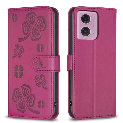 Funda para Motorola Moto G34 5G de Cuero con Relieve de Cuatro Hojas (Rojo Rosa)