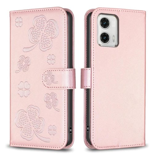 Funda de Cuero para Motorola Moto G73 5G con Relieve de Cuatro Hojas (Rosa)
