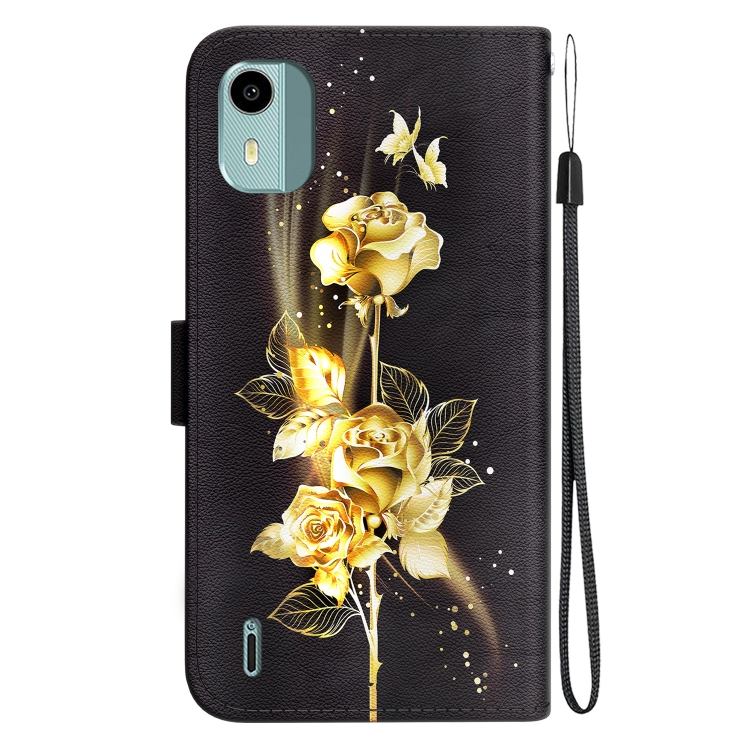 Funda de Cuero para Nokia C12 con Dibujo Coloreado y Textura de Cristal (Mariposa Dorada Rosa)