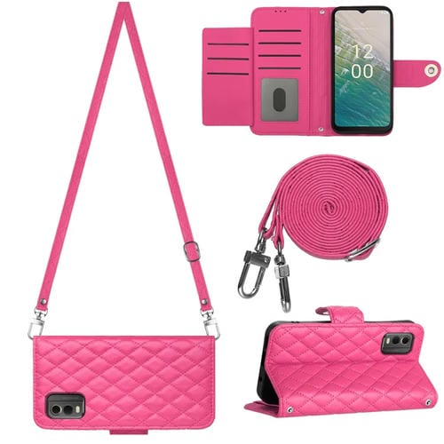 Funda para Nokia C32 de Cuero con Tapa Textura Rómbica y Cordón Largo (Rojo Rosa)