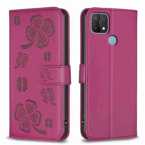 Para Oppo A15 Funda de Cuero con Relieve de Cuatro Hojas (Rojo Rosa)