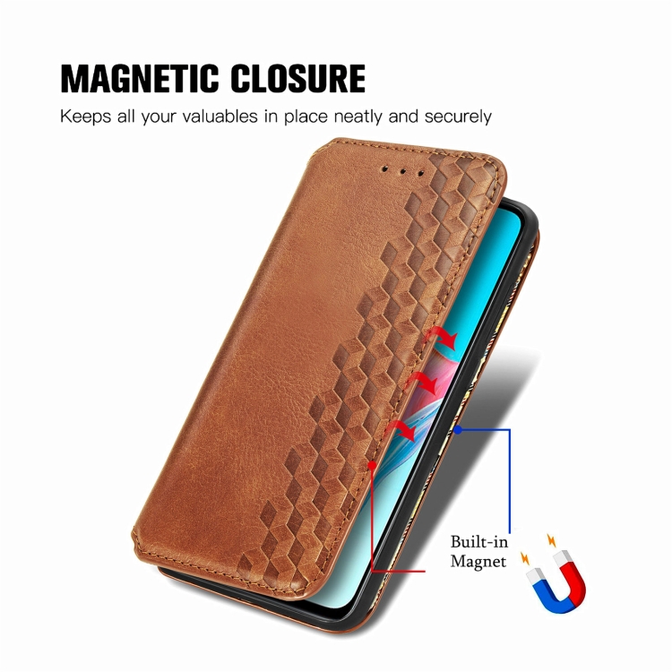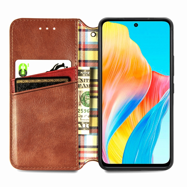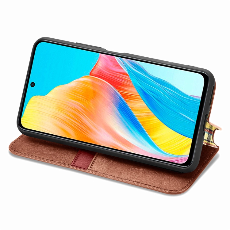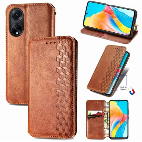 Para Oppo A98 Cubic Grid Funda de Teléfono de Cuero Magnético Prensado (Marrón)