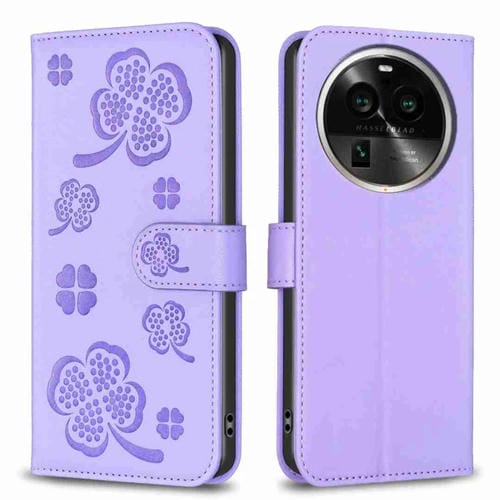 Para Oppo Find X6 Pro Funda de Cuero con Relieve de Cuatro Hojas para Teléfono (Púrpura)