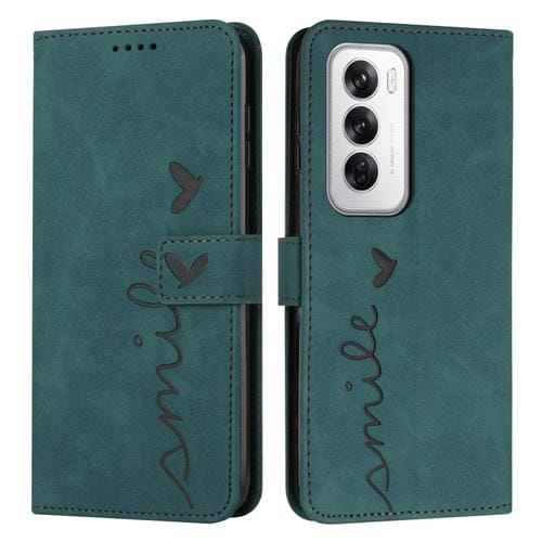 Para Oppo Reno12 5G Global Skin Feel Heart Funda para Teléfono de Cuero En Relieve con Cordón Largo (Verde)