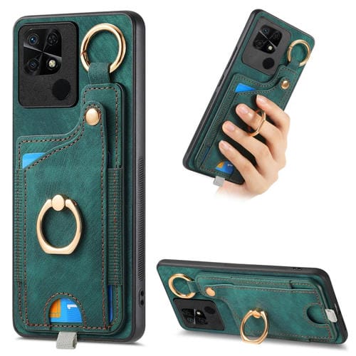 Para Redmi 10C Funda para Teléfono con Bolsa para Tarjeta con Anillo y Sensación de Piel Retro con Lazo para Colgar (Verde)