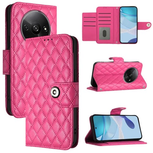 Para Redmi A3 Funda para Teléfono de Cuero con Tapa con Textura Rómbica y Cordón (Rojo Rosa)