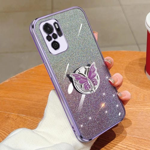 Para Redmi Note 10 4G Funda para Teléfono de TPU con Soporte de Mariposa con Brillo Degradado Plateado (Púrpura)