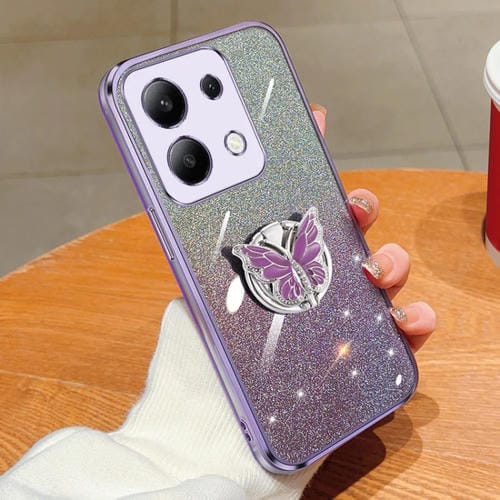 Para Redmi Note 13 4G Funda para Teléfono de TPU con Soporte de Mariposa con Brillo Degradado Plateado (Púrpura)