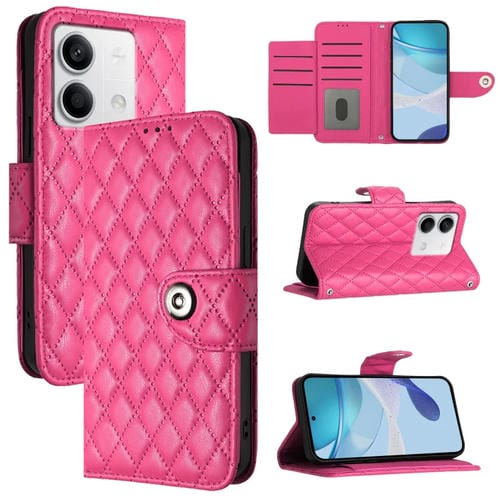 Para Redmi Note 13 5G Funda para Teléfono de Cuero con Tapa con Textura Rómbica Global y Cordón (Rojo Rosa)