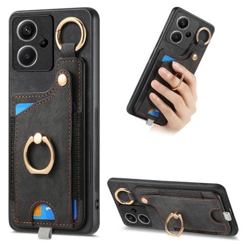 Para Redmi Note 13 Pro + 5G Funda para Teléfono con Bolsa para Tarjeta con Anillo y Sensación de Piel Retro con Lazo para Colgar (Negro)