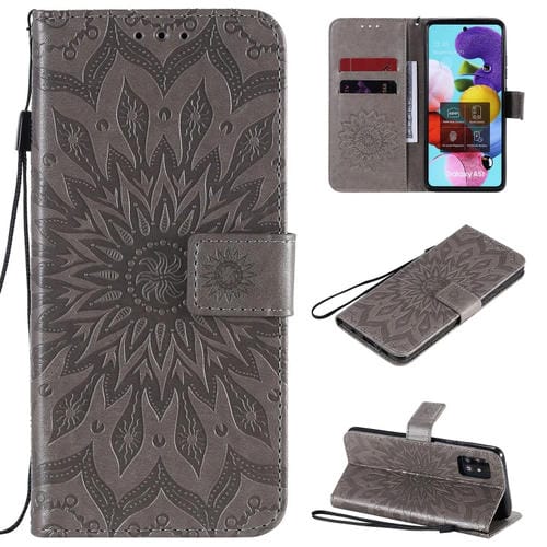 Estuche para Samsung Galaxy A51 5G Cuero Pu Diseño Girasol En Relieve Soporte Ranuras Tarjetas Billetera Cordón (Gris)
