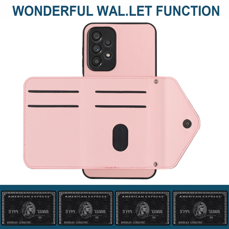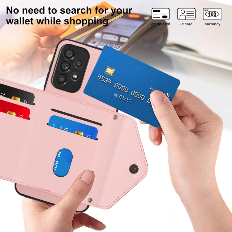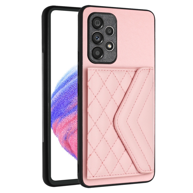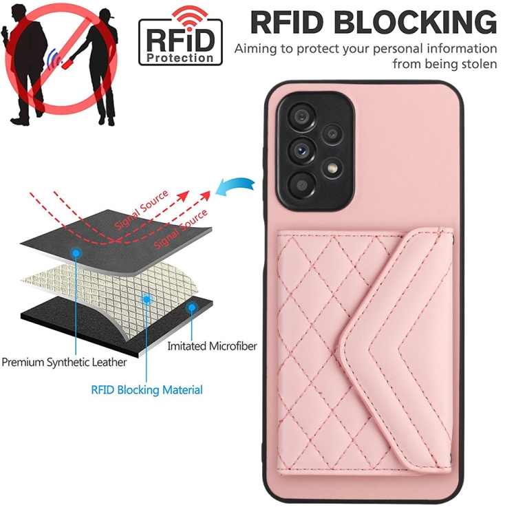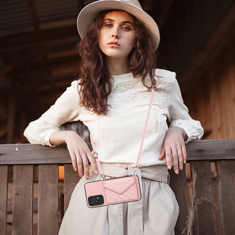 Estuche para Teléfono Samsung Galaxy A52 Rfid con Bolsa para Tarjetas Textura Rómbica y Cordón Largo (Oro Rosa)