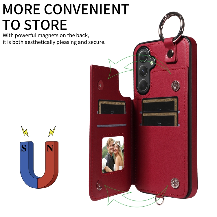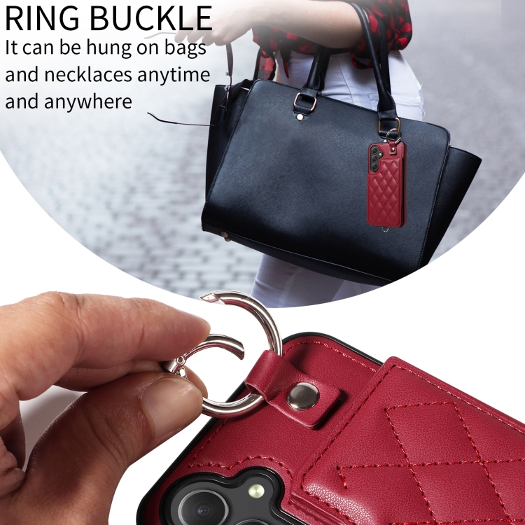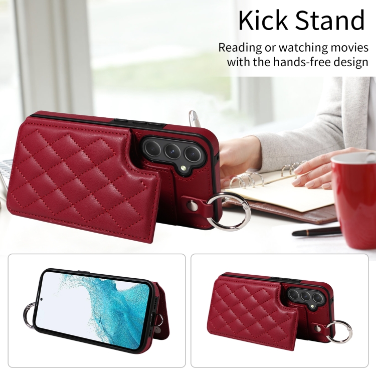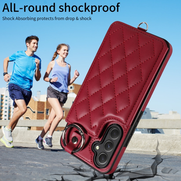 Estuche para Teléfono Samsung Galaxy A54 5G con Bolsa para Tarjetas Textura Rómbica y Cordón Corto (Rojo Vino)