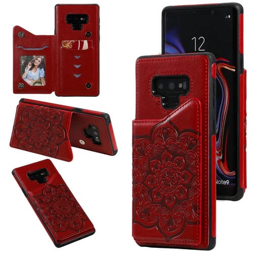 Estuche protector para Samsung Galaxy Note 9 con flor patrón en relieve, soporte, ranuras para tarjetas y marco de fotos (Rojo)