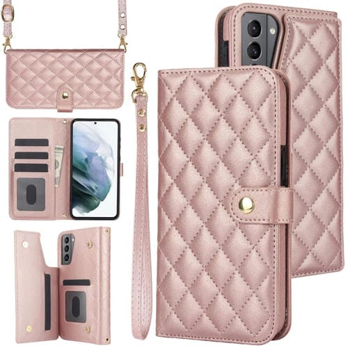 Funda Cruzada de Cuero Samsung Galaxy S21 FE 5G Rómbica Multifunción (Oro Rosa)