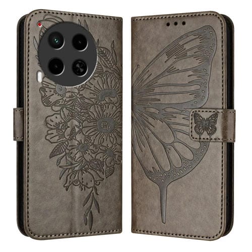 Funda de Cuero para Tecno Camon 30 4G y 5G con Mariposa En Relieve (Gris)