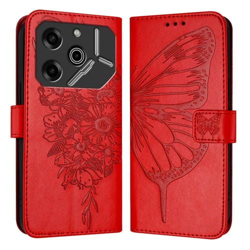 Funda de Cuero para Tecno Pova 6 Pro con Mariposa en Relieve (Rojo)