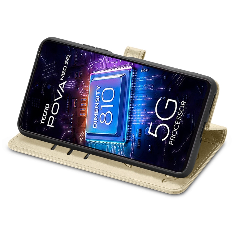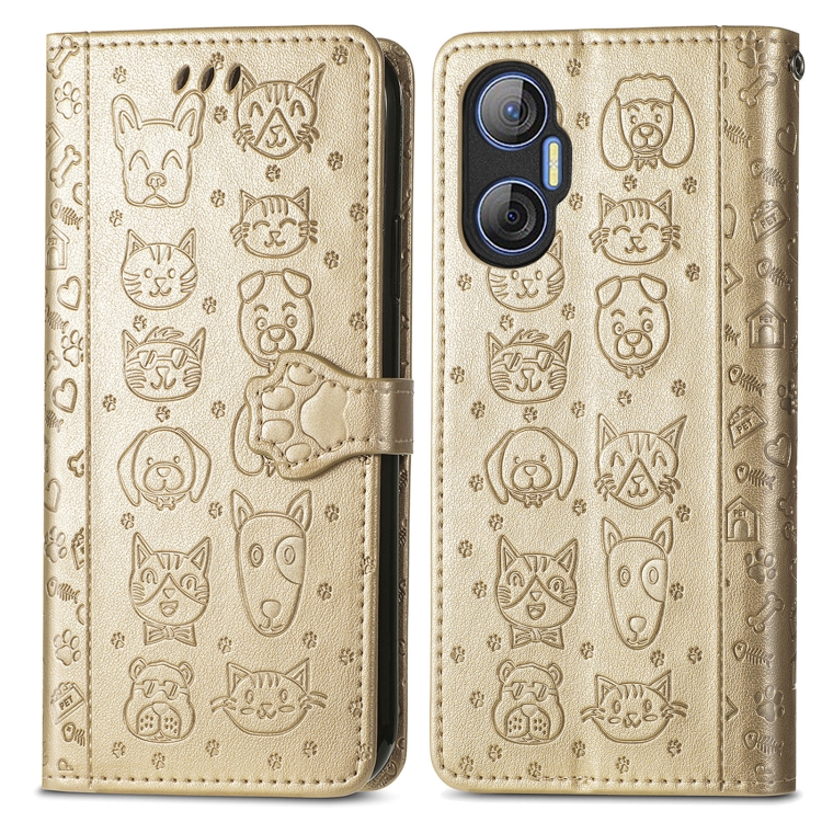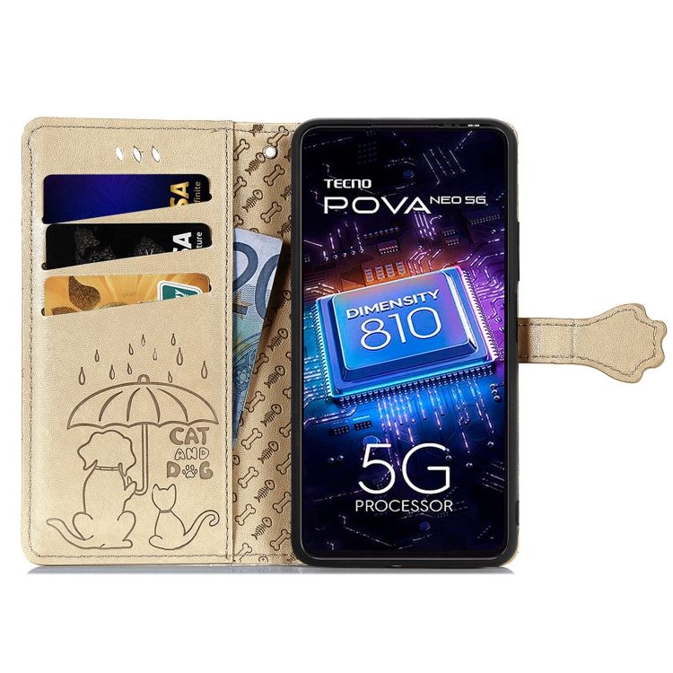 Funda de Cuero Tecno Pova Neo 5G Cat and Dog en Relieve (Oro)