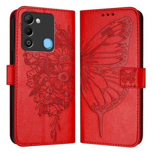 Funda de Cuero para Tecno Spark 9 con Mariposa en Relieve (Rojo)