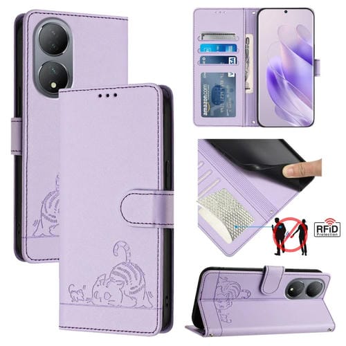 Para Vivo Y100 5G Global Cat Rat Estuche para Teléfono de Cuero Rfid con Patrón En Relieve y Cordón (Púrpura)